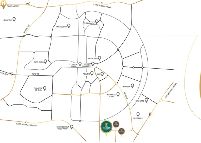 • يتمتع ذا ايكون جاردنز التجمع الخامس The Icon Gardens New Cairo بموقع استراتيجي يسهل الوصول إلى المحاور الرئيسية، مما يجعل التنقل إلى المناطق الحيوية أمرًا سلسًا.